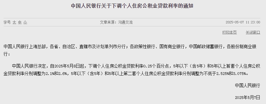 5月7日,中国人民银行决定,自2025年5月8日起,下调个人住房公积金贷款利率0.25个百分点。