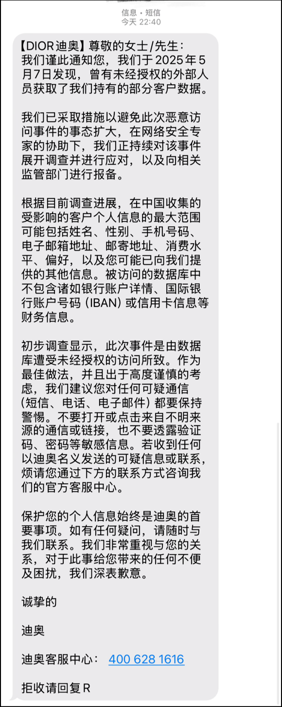 5月12日深夜,法国奢侈品牌迪奥(Dior)向中国客户群发警示短信,称其数据库于2025年5月7日遭外部人员未授权访问,导致部分客户个人信息外泄。值得关注的是,从发现漏洞到通知客户,迪奥延迟了整整五天。